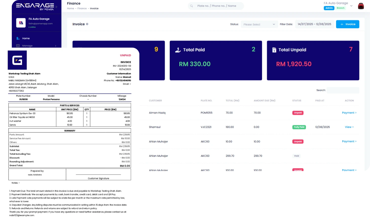 Hasilkan invois lengkap secara automatik untuk servis, alat ganti kenderaan, dan kos tenaga kerja dalam sistem.