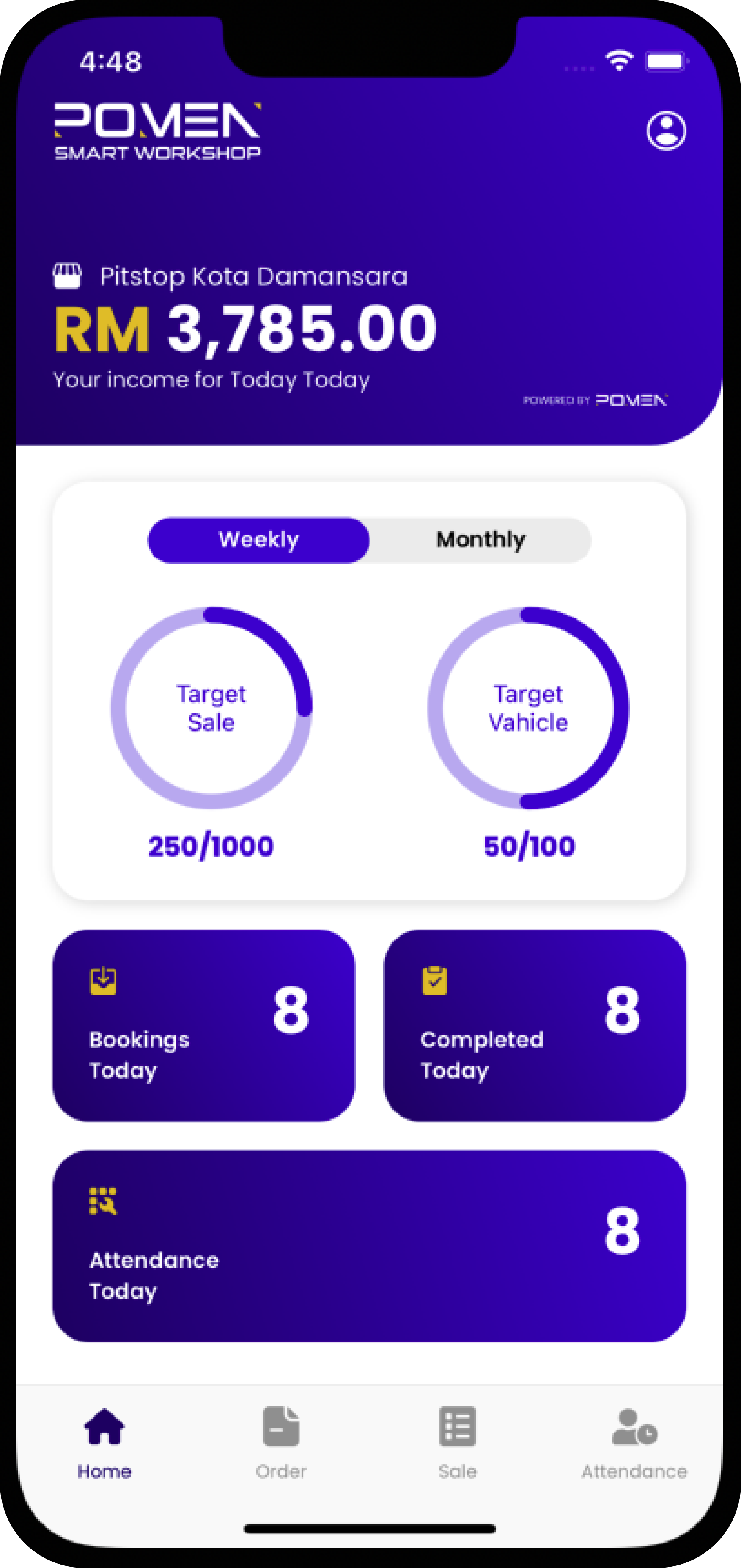 Semua jualan direkod secara automatik — hari ni, minggu ni, bulan ni, terus nampak prestasi bengkel.